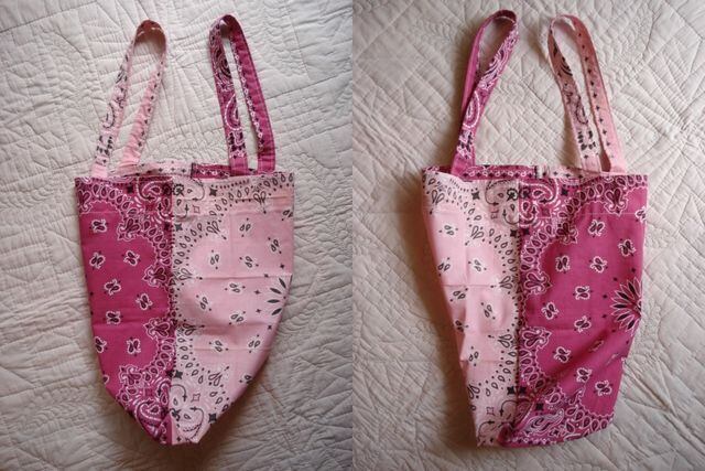本体、持ち手、内ポケット、バンダナならではの柄をバランスよく配分して2枚をフルに使い切ったオリジナルのバッグです。