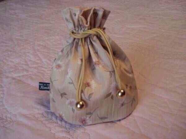 表地はコットン100%、ややシワ加工の素材なので、品のある淡い色柄が引き立ちます。 ヒモ通しの位置がやや下なので、中身を入れてヒモを結んだときのぷっくり感とクチ部分のヒラヒラ感がとっても愛らしいです。